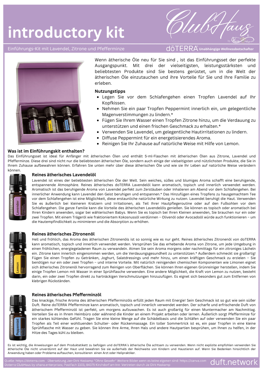 Entdecken jetzt die Welt der ätherischen Öle mit dem Doterra Einsteiger-Kit. Dieses Kit enthält eine drei der beliebtesten Öle von Doterra, die Dir helfen können, Deine Gesundheit und Wohlbefinden zu verbessern. Mit dem Kit erhaltst Du auch Zugang zu exklusiven Ressourcen und Unterstützung durch unsere erfahrenen Ölexperten über WhatsApp. Bezahlen Sie einfach mit PayPal Freunde und die Bestellen Deines Doterra Einsteiger-Kit wie auch die PDF werden nach Zahlungseingang schnellstmöglich versendet, damit auch Du die Vorteile ätherischer Öle selbst erleben kannst.